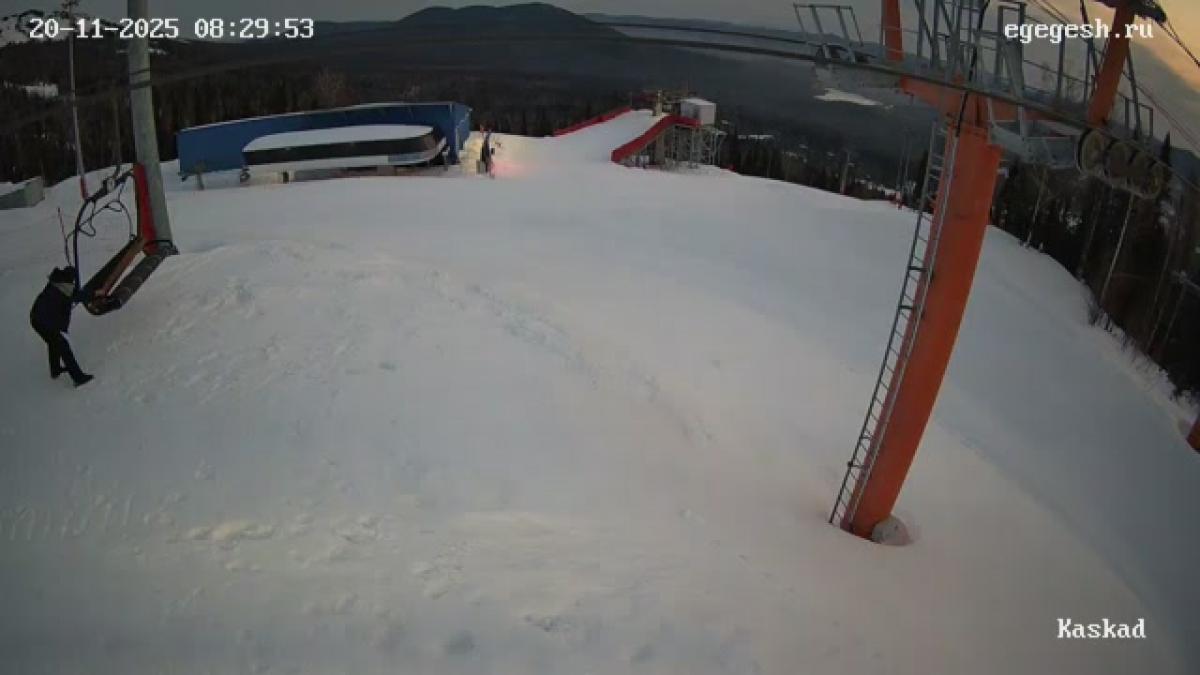 Веб-камера показывает начало зоны высадки с кресельного подъёмника «Булочка» в секторе B. Вдали слева виден подъёмник «Мустаг», а правее - высадка с кресельной дороги «Запад».