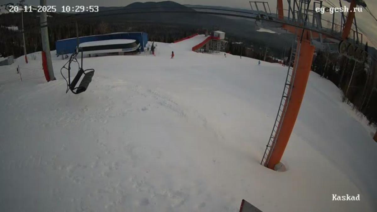 Веб-камера показывает начало зоны высадки с кресельного подъёмника «Булочка» в секторе B. Вдали слева виден подъёмник «Мустаг», а правее - высадка с кресельной дороги «Запад».