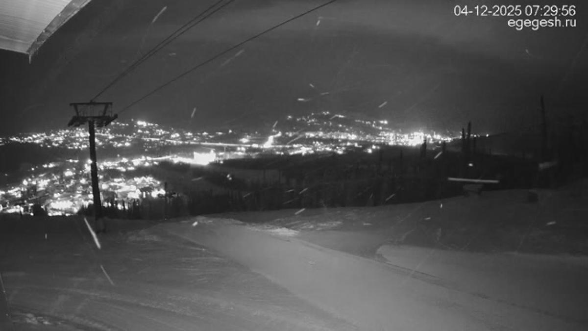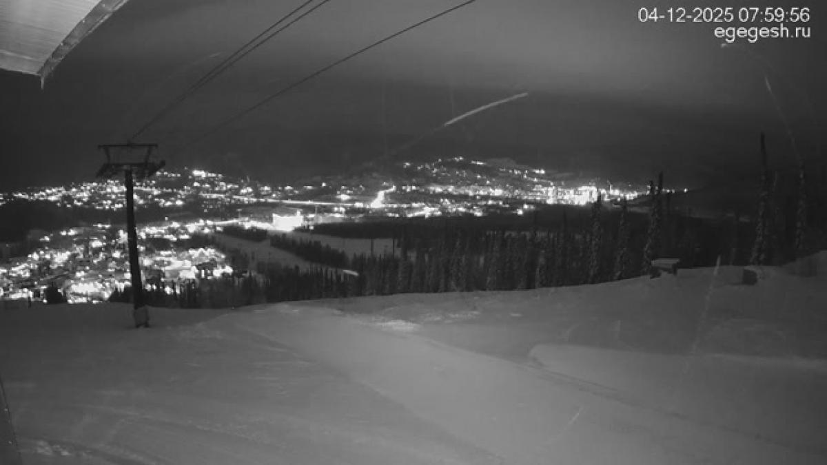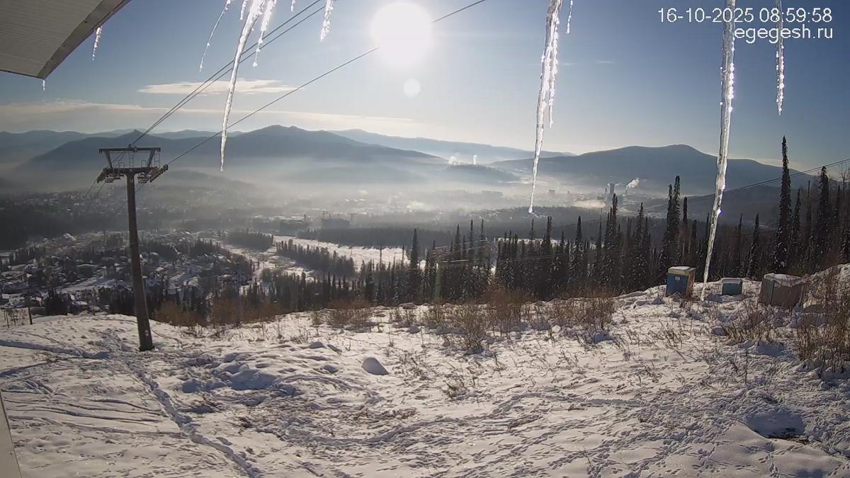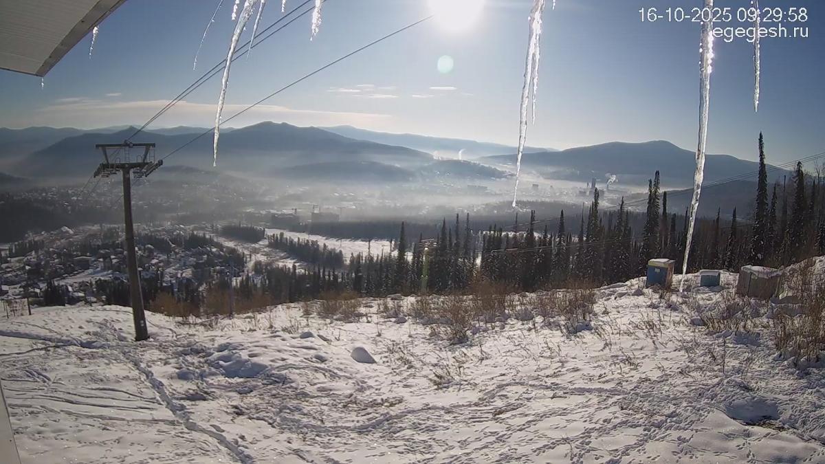 В объективе обзорной веб-камеры открывается вид на подъёмник «Олимпия-Экспресс», отели на горе Зелёная и посёлок Шерегеш. Справа на видео виден кресельный подъёмник «Фристайл».