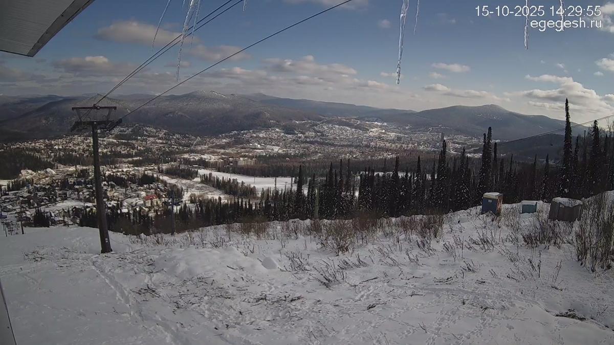 В объективе обзорной веб-камеры открывается вид на подъёмник «Олимпия-Экспресс», отели на горе Зелёная и посёлок Шерегеш. Справа на видео виден кресельный подъёмник «Фристайл».