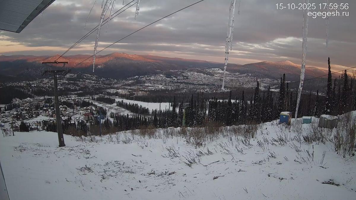 В объективе обзорной веб-камеры открывается вид на подъёмник «Олимпия-Экспресс», отели на горе Зелёная и посёлок Шерегеш. Справа на видео виден кресельный подъёмник «Фристайл».