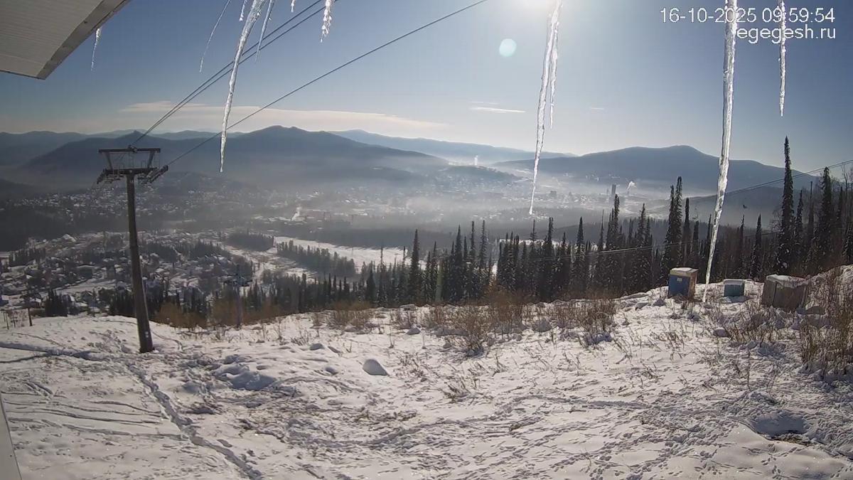 В объективе обзорной веб-камеры открывается вид на подъёмник «Олимпия-Экспресс», отели на горе Зелёная и посёлок Шерегеш. Справа на видео виден кресельный подъёмник «Фристайл».