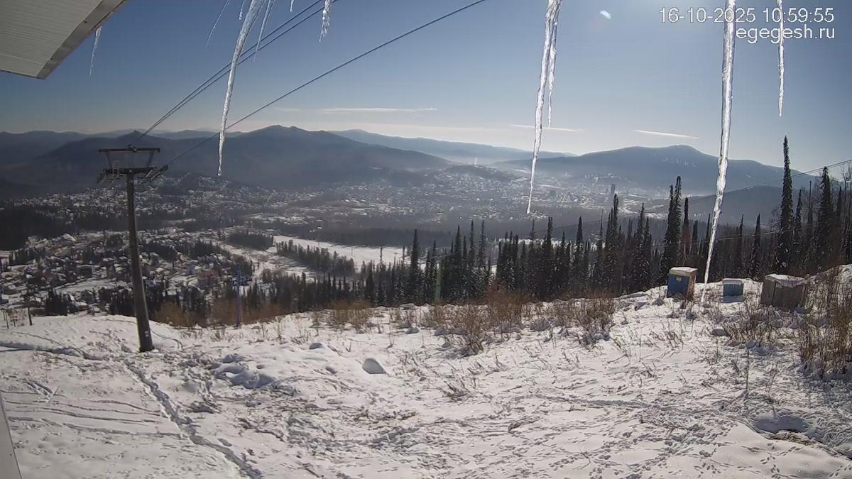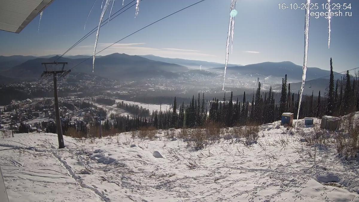 В объективе обзорной веб-камеры открывается вид на подъёмник «Олимпия-Экспресс», отели на горе Зелёная и посёлок Шерегеш. Справа на видео виден кресельный подъёмник «Фристайл».