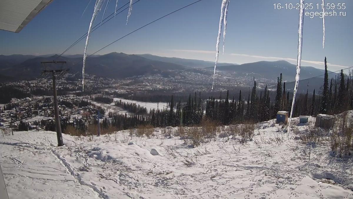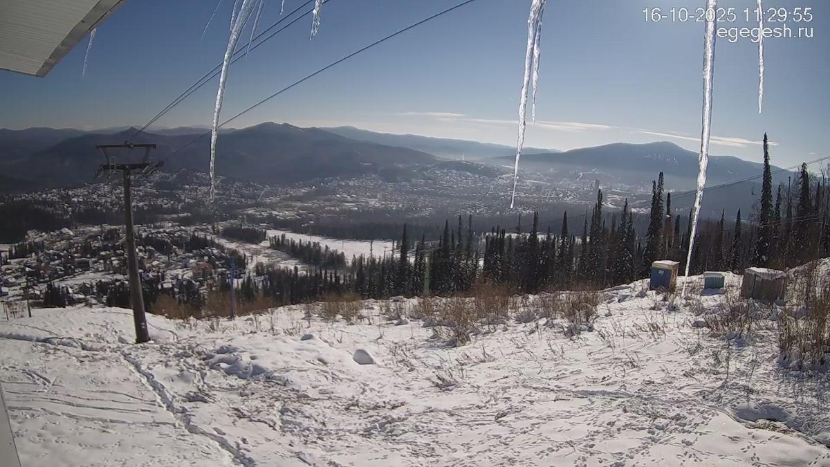 В объективе обзорной веб-камеры открывается вид на подъёмник «Олимпия-Экспресс», отели на горе Зелёная и посёлок Шерегеш. Справа на видео виден кресельный подъёмник «Фристайл».