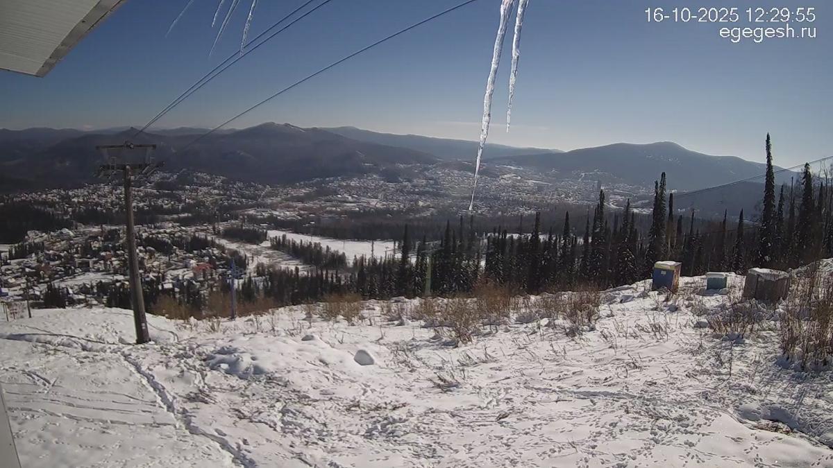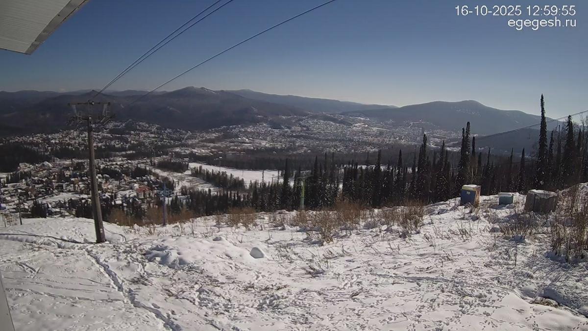 В объективе обзорной веб-камеры открывается вид на подъёмник «Олимпия-Экспресс», отели на горе Зелёная и посёлок Шерегеш. Справа на видео виден кресельный подъёмник «Фристайл».