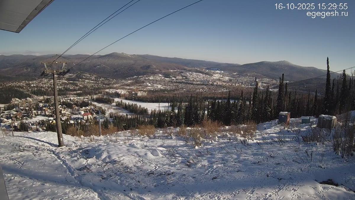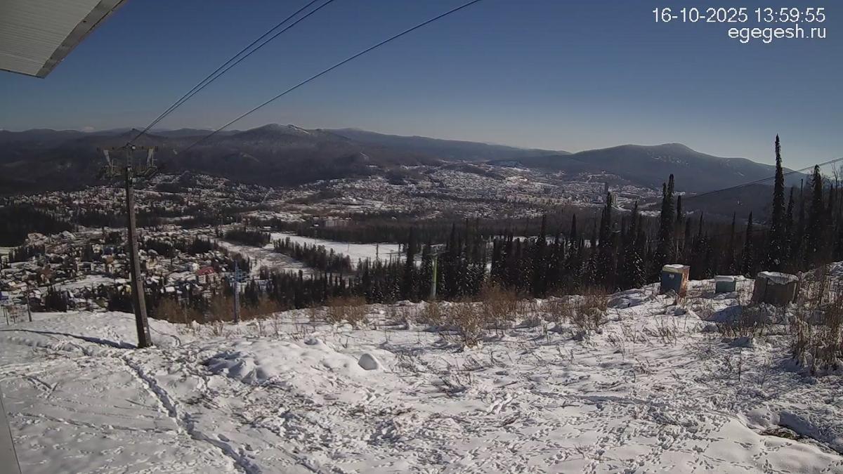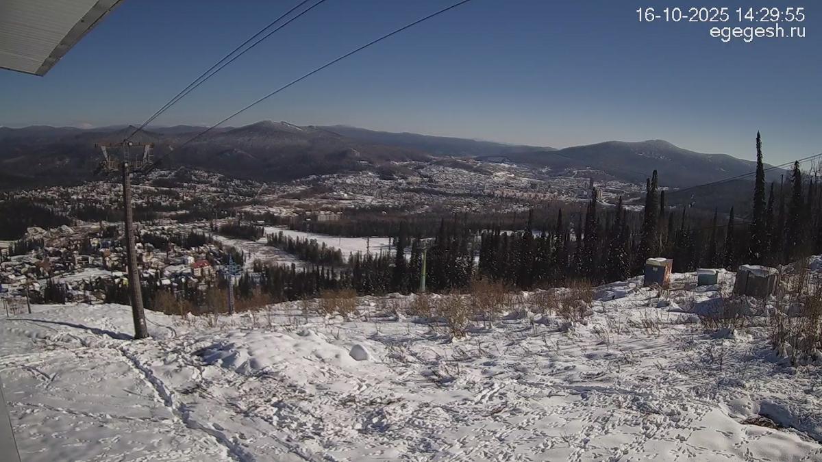 В объективе обзорной веб-камеры открывается вид на подъёмник «Олимпия-Экспресс», отели на горе Зелёная и посёлок Шерегеш. Справа на видео виден кресельный подъёмник «Фристайл».