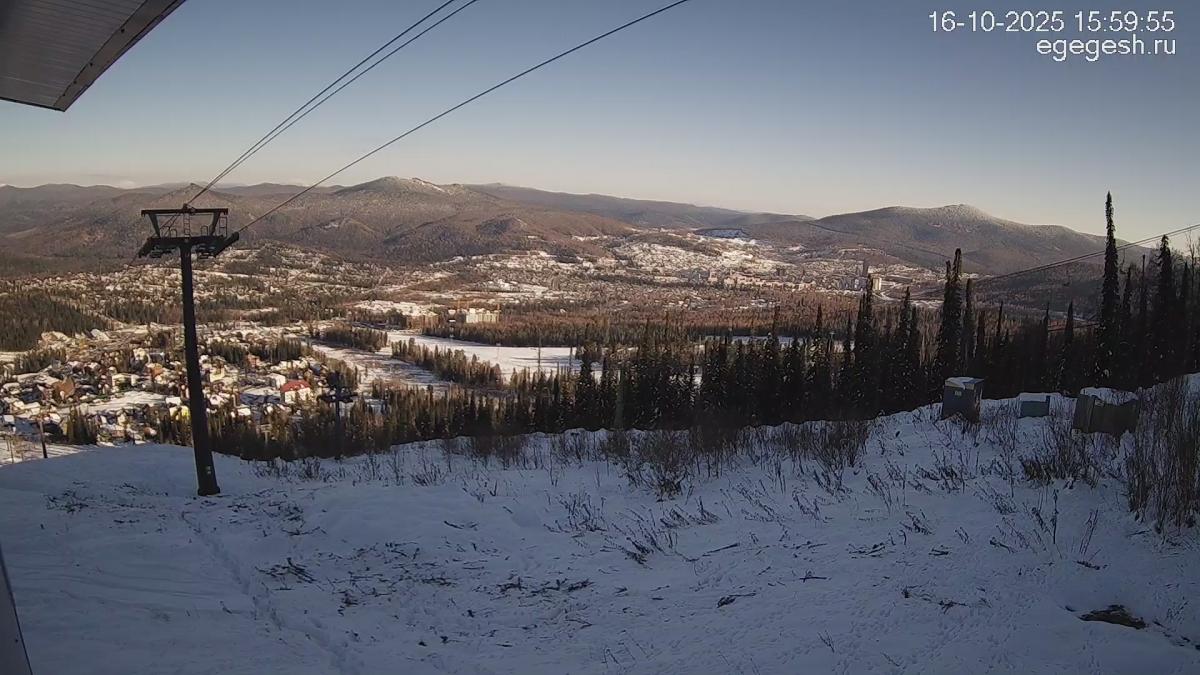 В объективе обзорной веб-камеры открывается вид на подъёмник «Олимпия-Экспресс», отели на горе Зелёная и посёлок Шерегеш. Справа на видео виден кресельный подъёмник «Фристайл».