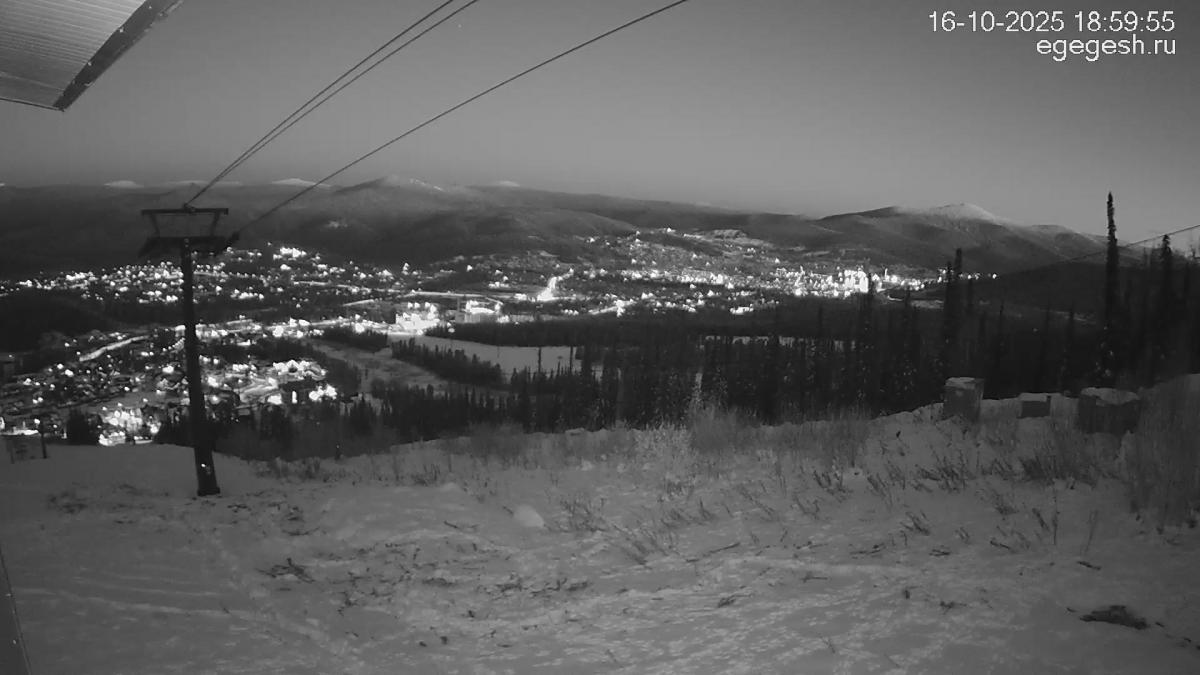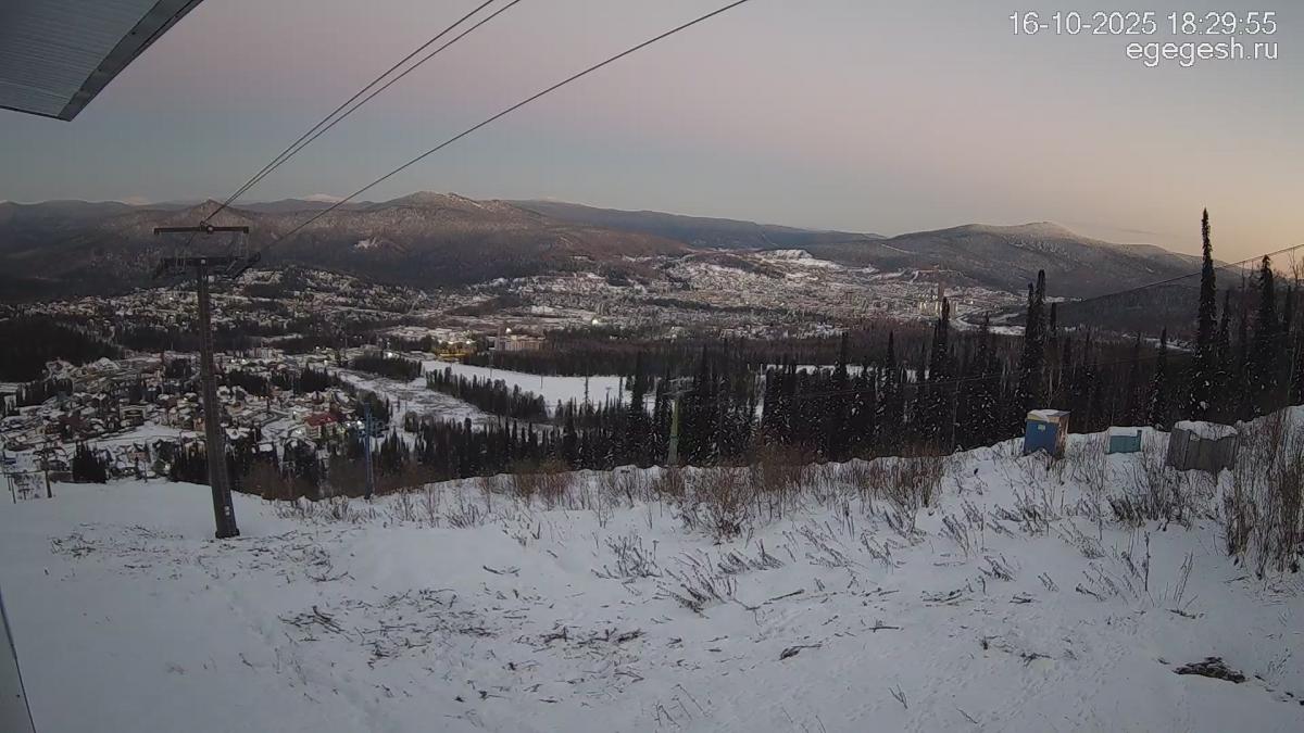 В объективе обзорной веб-камеры открывается вид на подъёмник «Олимпия-Экспресс», отели на горе Зелёная и посёлок Шерегеш. Справа на видео виден кресельный подъёмник «Фристайл».