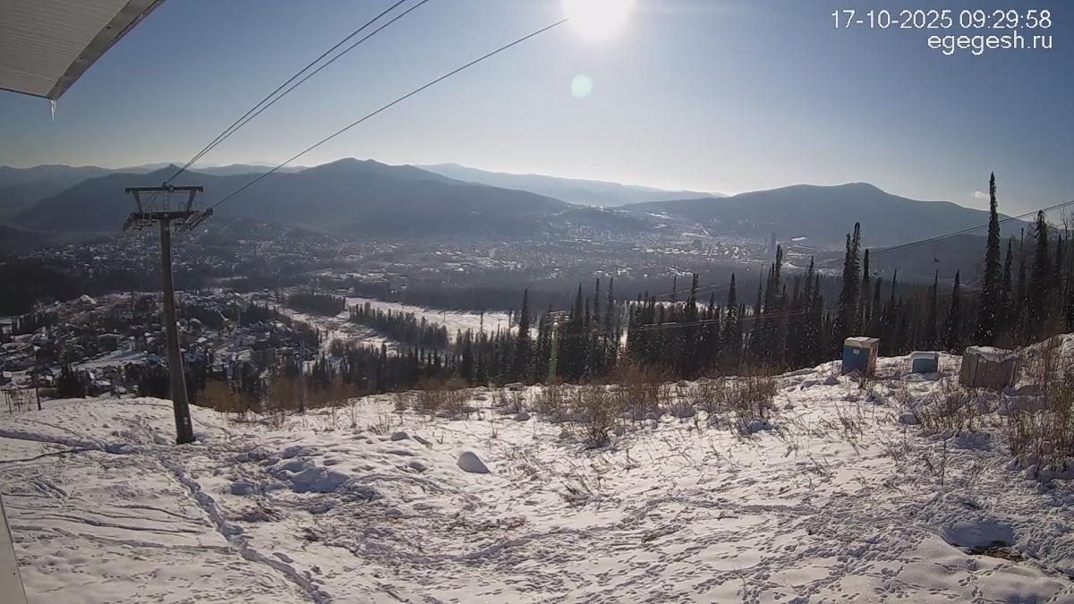 В объективе обзорной веб-камеры открывается вид на подъёмник «Олимпия-Экспресс», отели на горе Зелёная и посёлок Шерегеш. Справа на видео виден кресельный подъёмник «Фристайл».