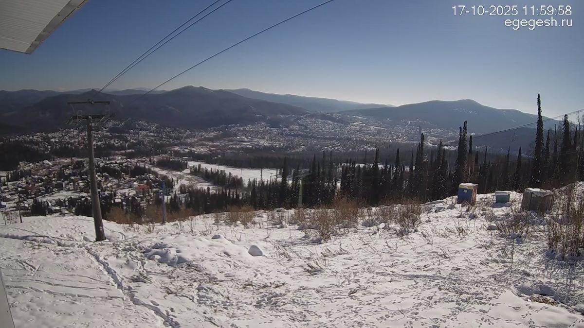 В объективе обзорной веб-камеры открывается вид на подъёмник «Олимпия-Экспресс», отели на горе Зелёная и посёлок Шерегеш. Справа на видео виден кресельный подъёмник «Фристайл».