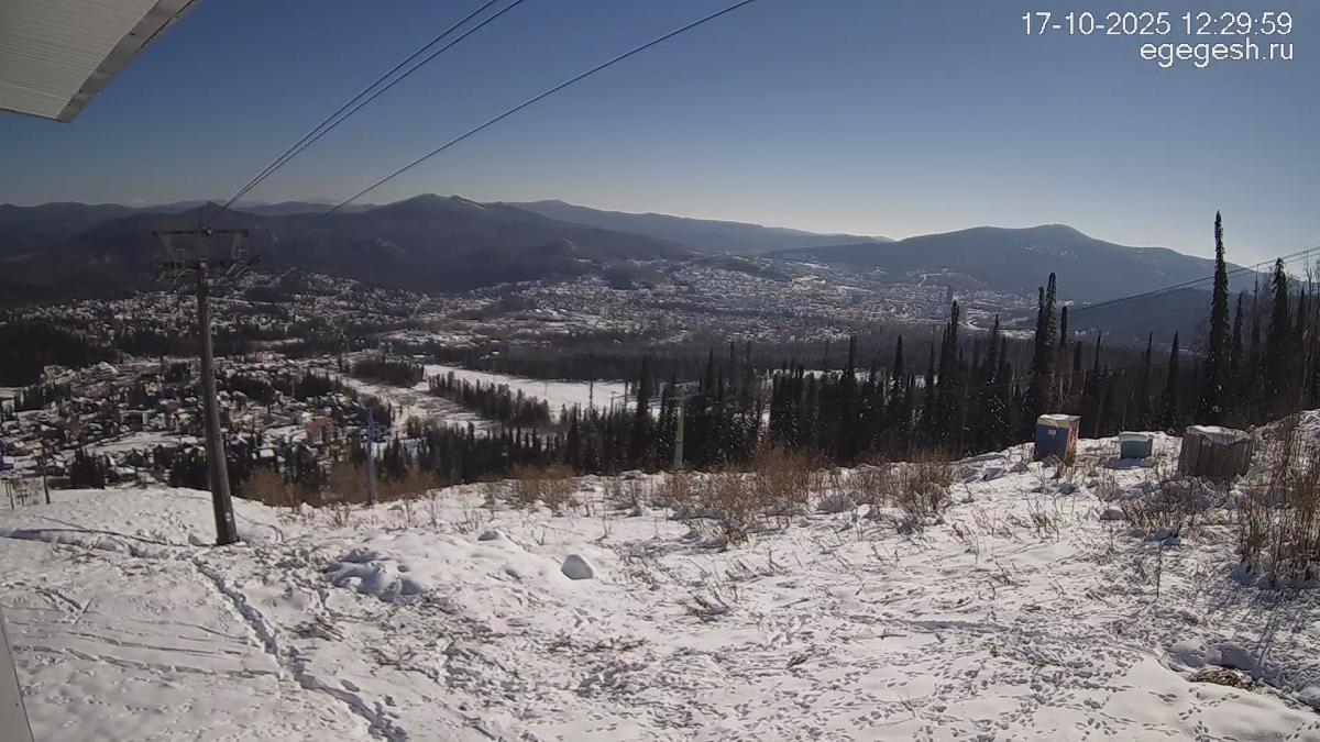 В объективе обзорной веб-камеры открывается вид на подъёмник «Олимпия-Экспресс», отели на горе Зелёная и посёлок Шерегеш. Справа на видео виден кресельный подъёмник «Фристайл».