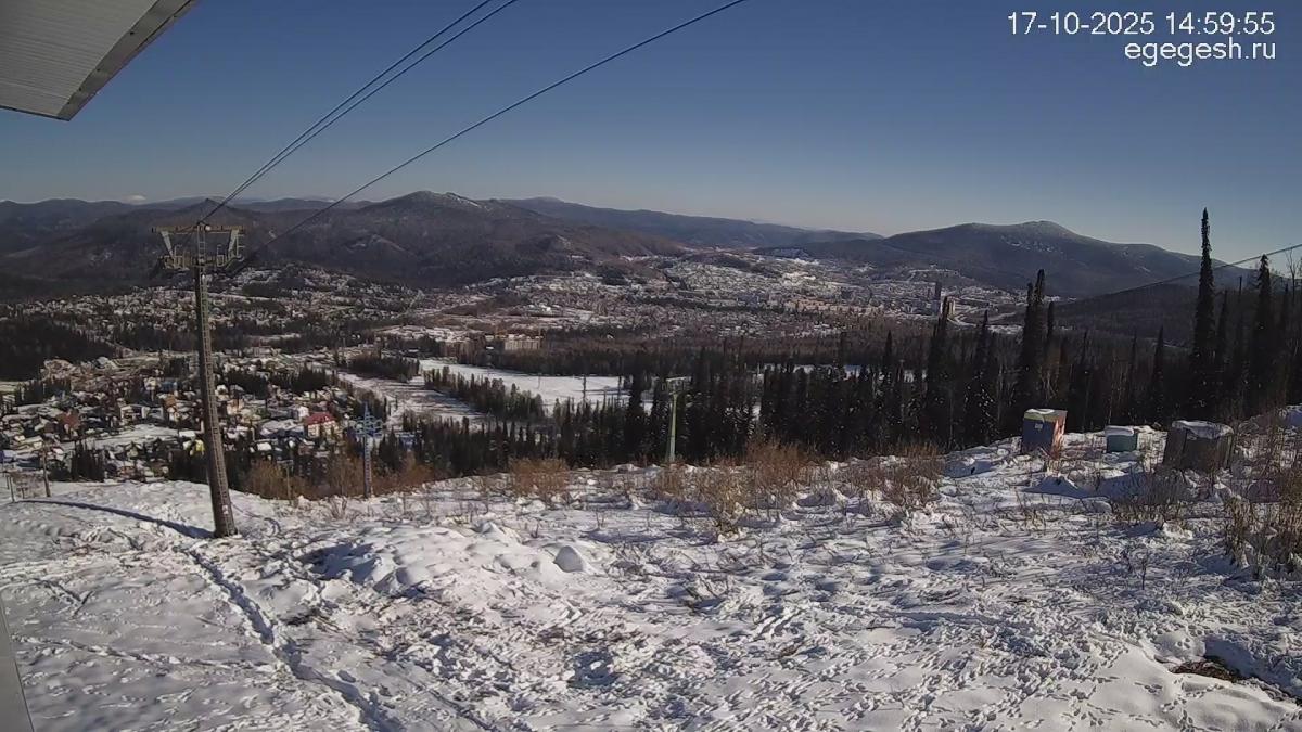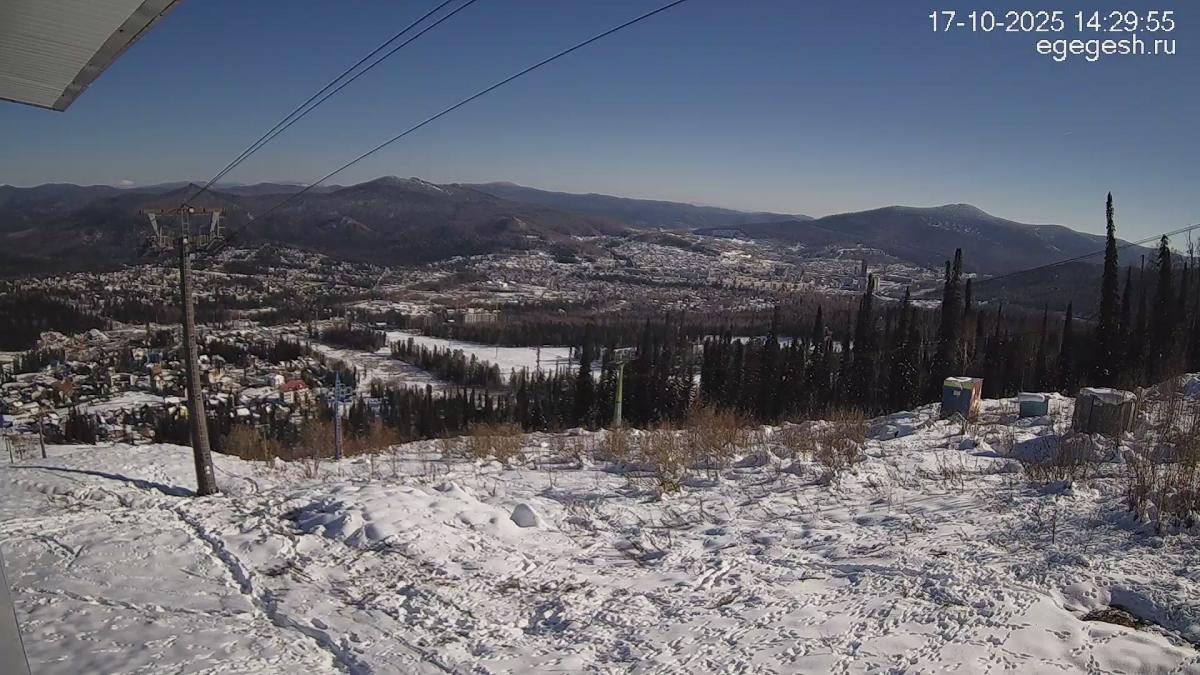 В объективе обзорной веб-камеры открывается вид на подъёмник «Олимпия-Экспресс», отели на горе Зелёная и посёлок Шерегеш. Справа на видео виден кресельный подъёмник «Фристайл».