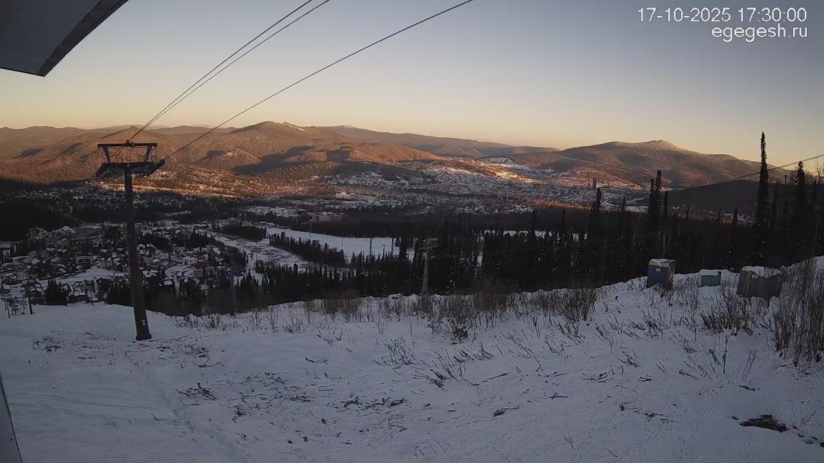 В объективе обзорной веб-камеры открывается вид на подъёмник «Олимпия-Экспресс», отели на горе Зелёная и посёлок Шерегеш. Справа на видео виден кресельный подъёмник «Фристайл».
