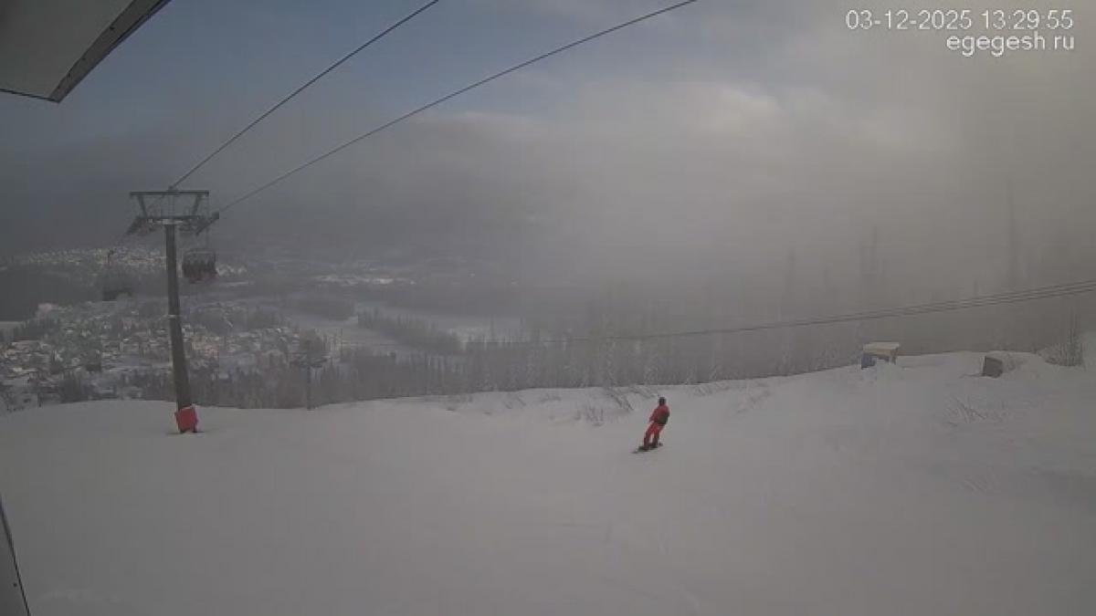 В объективе обзорной веб-камеры открывается вид на подъёмник «Олимпия-Экспресс», отели на горе Зелёная и посёлок Шерегеш. Справа на видео виден кресельный подъёмник «Фристайл».