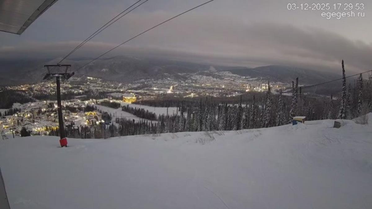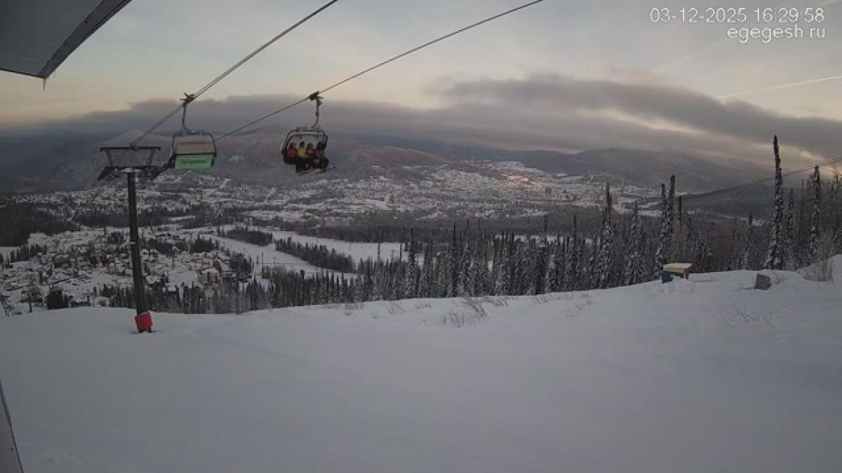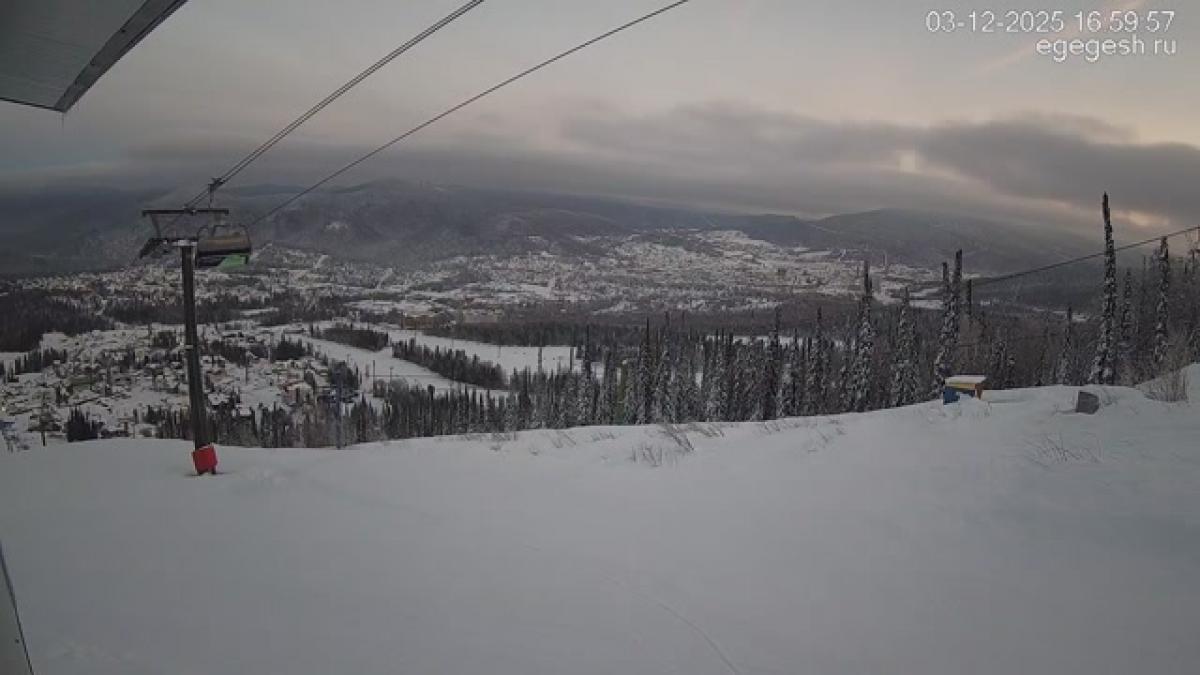В объективе обзорной веб-камеры открывается вид на подъёмник «Олимпия-Экспресс», отели на горе Зелёная и посёлок Шерегеш. Справа на видео виден кресельный подъёмник «Фристайл».