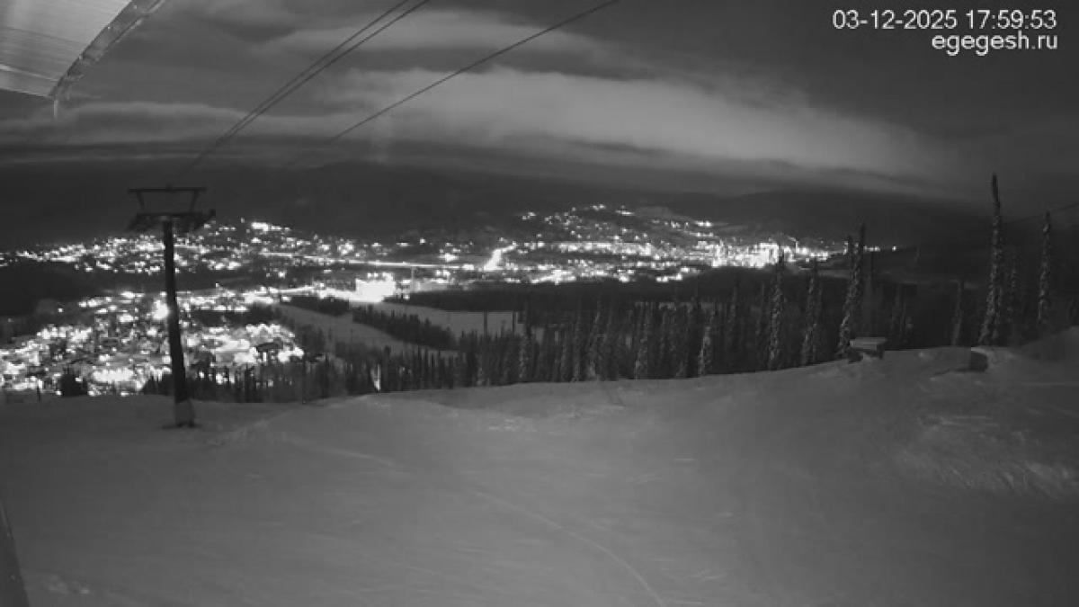 В объективе обзорной веб-камеры открывается вид на подъёмник «Олимпия-Экспресс», отели на горе Зелёная и посёлок Шерегеш. Справа на видео виден кресельный подъёмник «Фристайл».