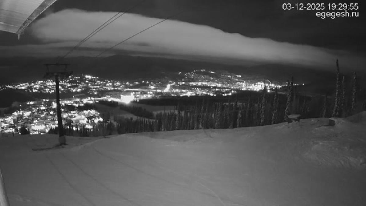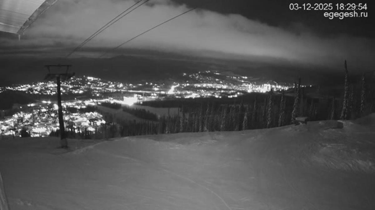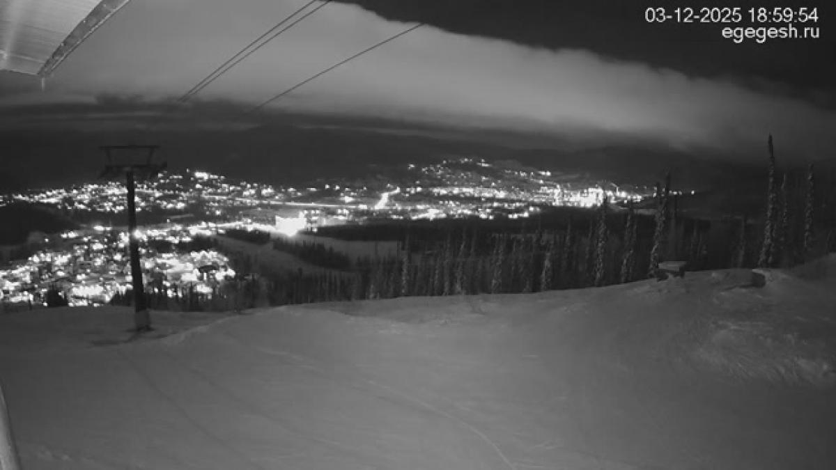 В объективе обзорной веб-камеры открывается вид на подъёмник «Олимпия-Экспресс», отели на горе Зелёная и посёлок Шерегеш. Справа на видео виден кресельный подъёмник «Фристайл».