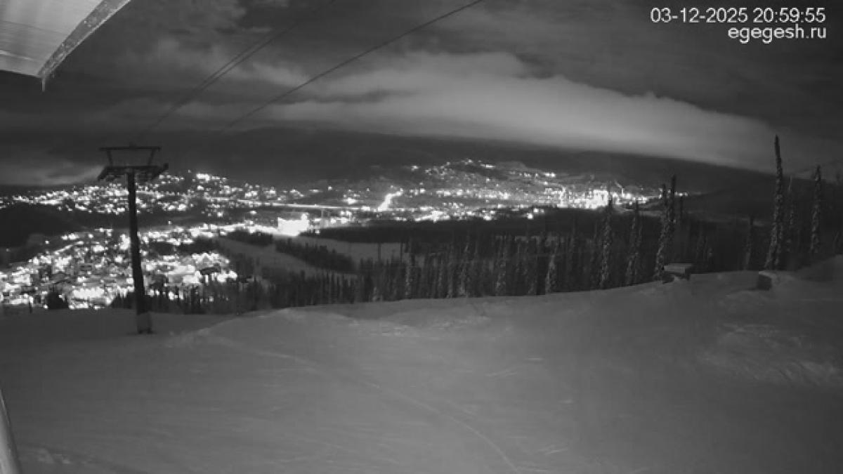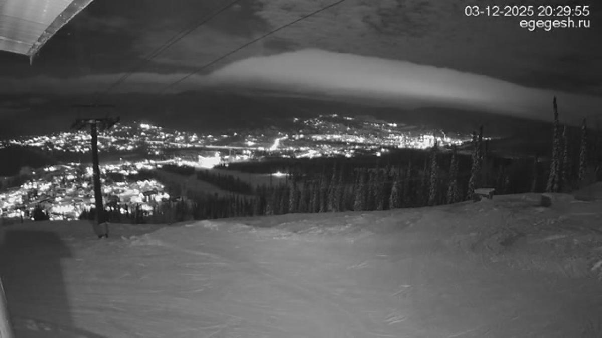 В объективе обзорной веб-камеры открывается вид на подъёмник «Олимпия-Экспресс», отели на горе Зелёная и посёлок Шерегеш. Справа на видео виден кресельный подъёмник «Фристайл».
