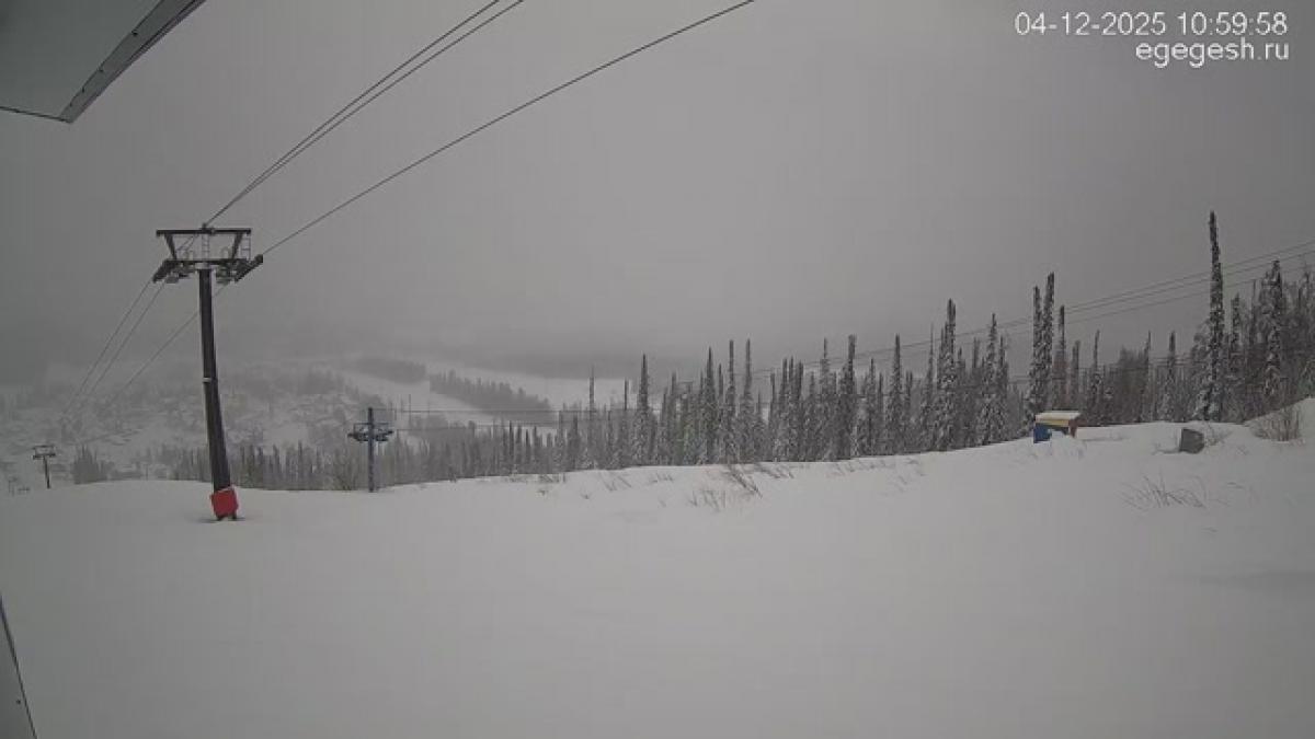 В объективе обзорной веб-камеры открывается вид на подъёмник «Олимпия-Экспресс», отели на горе Зелёная и посёлок Шерегеш. Справа на видео виден кресельный подъёмник «Фристайл».