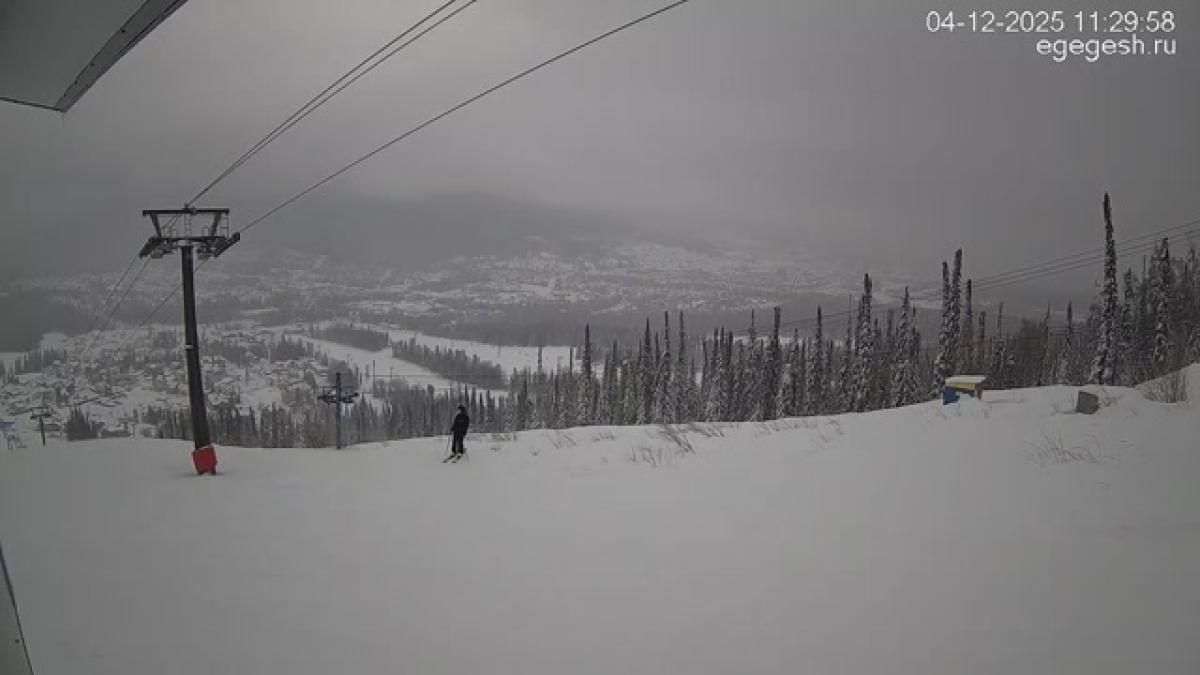 В объективе обзорной веб-камеры открывается вид на подъёмник «Олимпия-Экспресс», отели на горе Зелёная и посёлок Шерегеш. Справа на видео виден кресельный подъёмник «Фристайл».