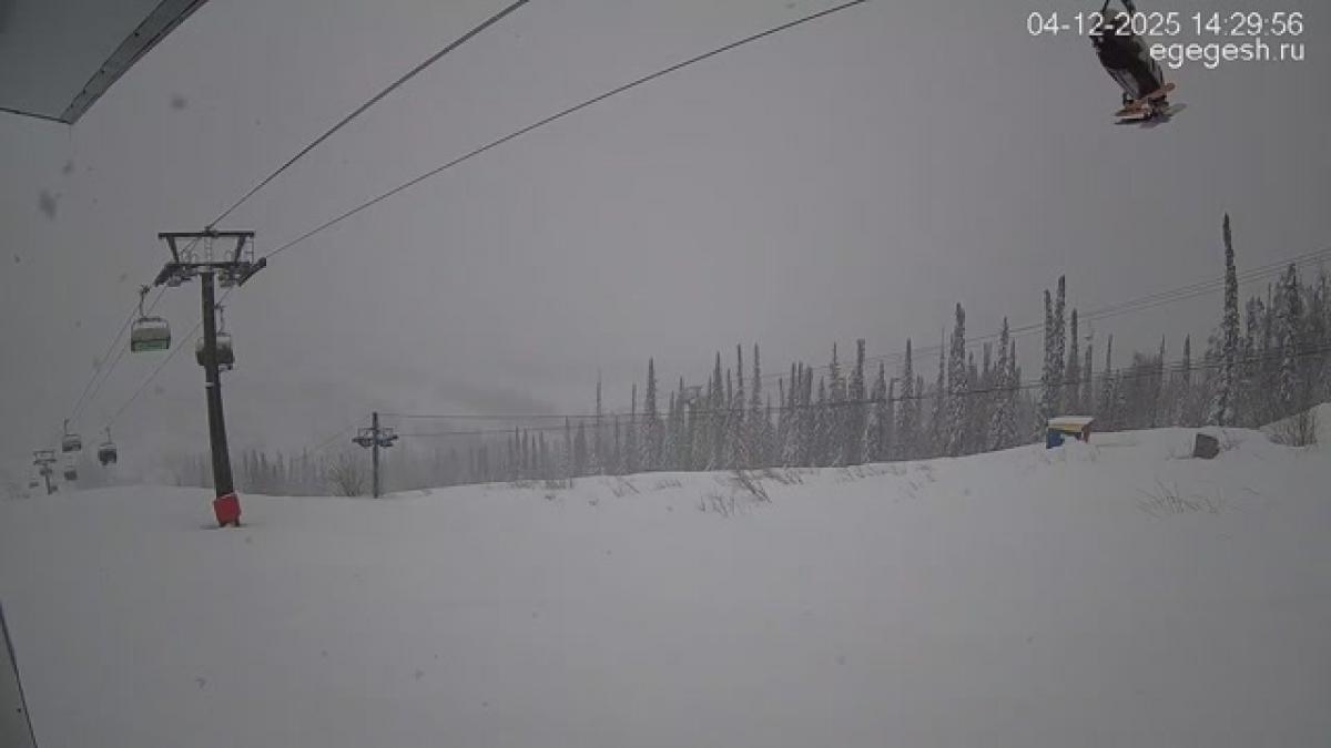 В объективе обзорной веб-камеры открывается вид на подъёмник «Олимпия-Экспресс», отели на горе Зелёная и посёлок Шерегеш. Справа на видео виден кресельный подъёмник «Фристайл».