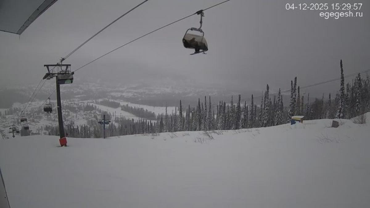 В объективе обзорной веб-камеры открывается вид на подъёмник «Олимпия-Экспресс», отели на горе Зелёная и посёлок Шерегеш. Справа на видео виден кресельный подъёмник «Фристайл».