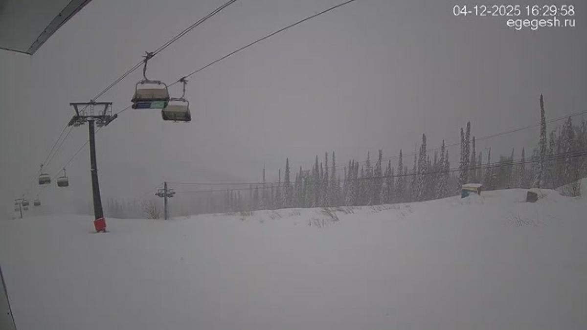 В объективе обзорной веб-камеры открывается вид на подъёмник «Олимпия-Экспресс», отели на горе Зелёная и посёлок Шерегеш. Справа на видео виден кресельный подъёмник «Фристайл».