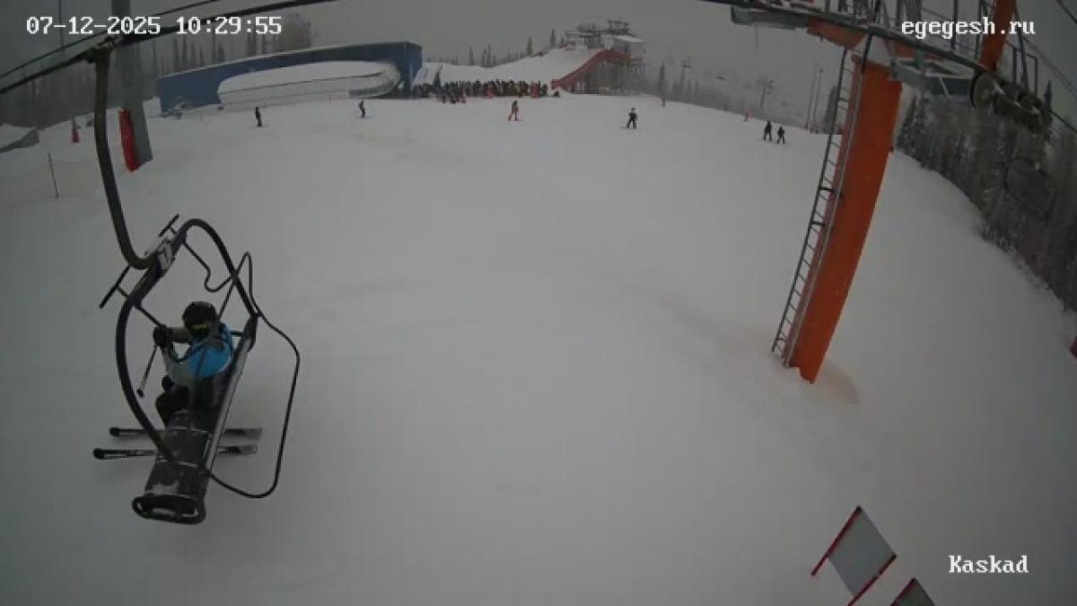 Веб-камера показывает начало зоны высадки с кресельного подъёмника «Булочка» в секторе B. Вдали слева виден подъёмник «Мустаг», а правее - высадка с кресельной дороги «Запад».