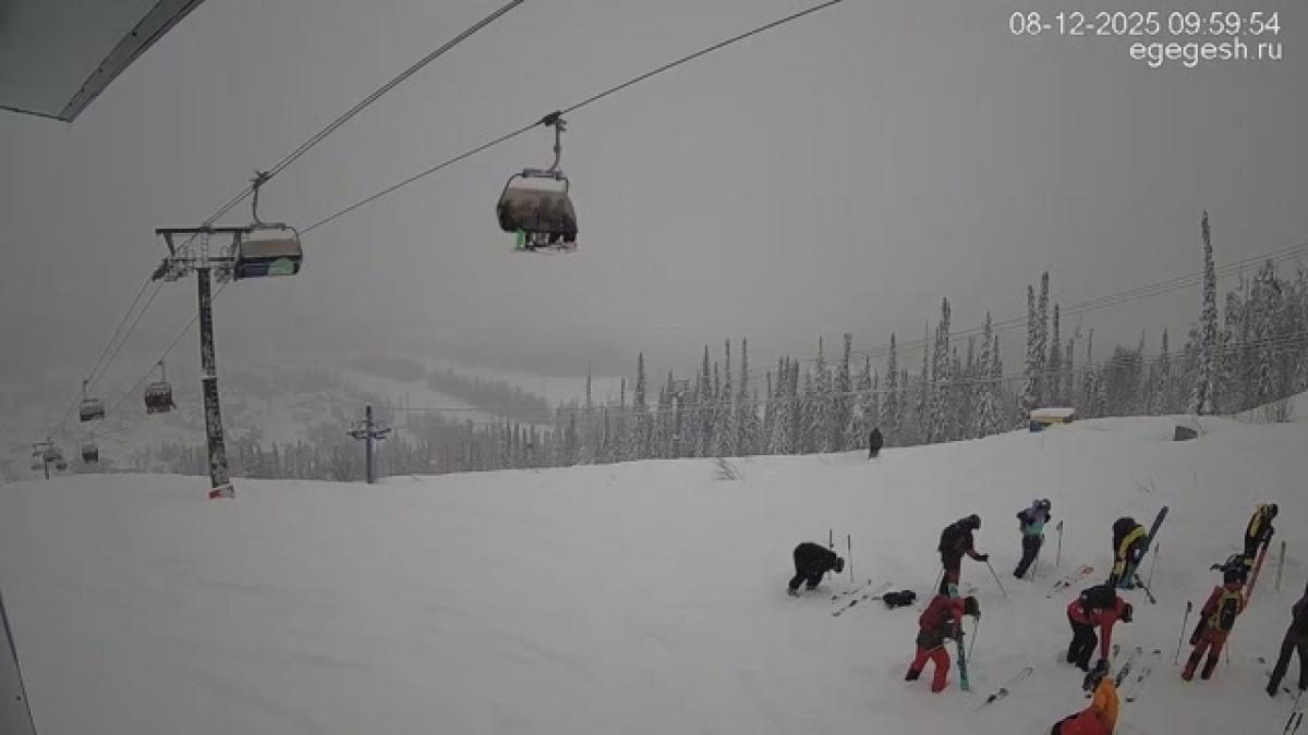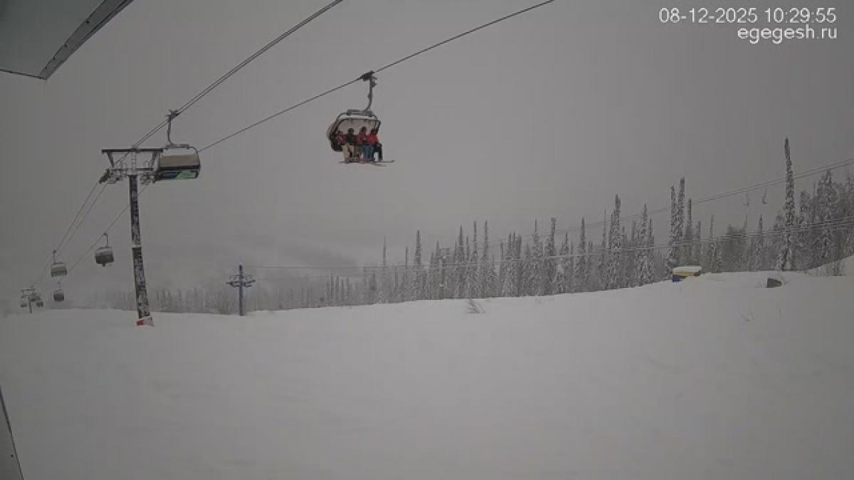 В объективе обзорной веб-камеры открывается вид на подъёмник «Олимпия-Экспресс», отели на горе Зелёная и посёлок Шерегеш. Справа на видео виден кресельный подъёмник «Фристайл».