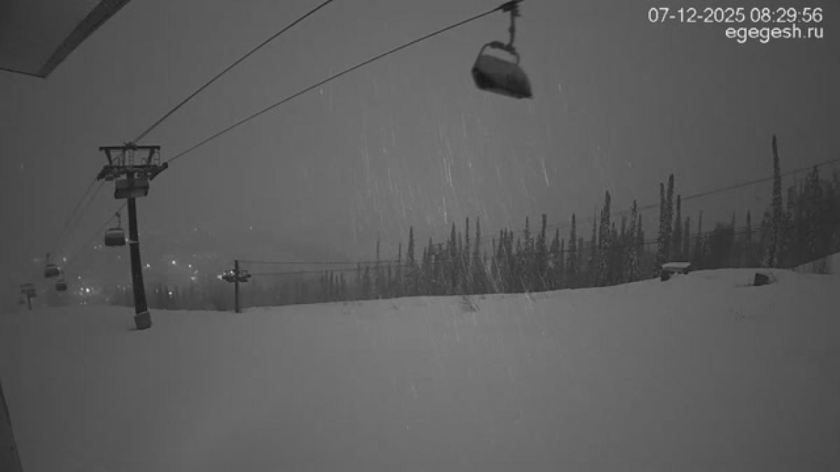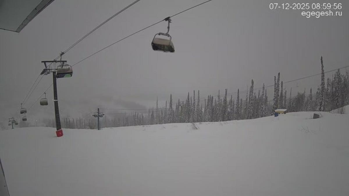 В объективе обзорной веб-камеры открывается вид на подъёмник «Олимпия-Экспресс», отели на горе Зелёная и посёлок Шерегеш. Справа на видео виден кресельный подъёмник «Фристайл».