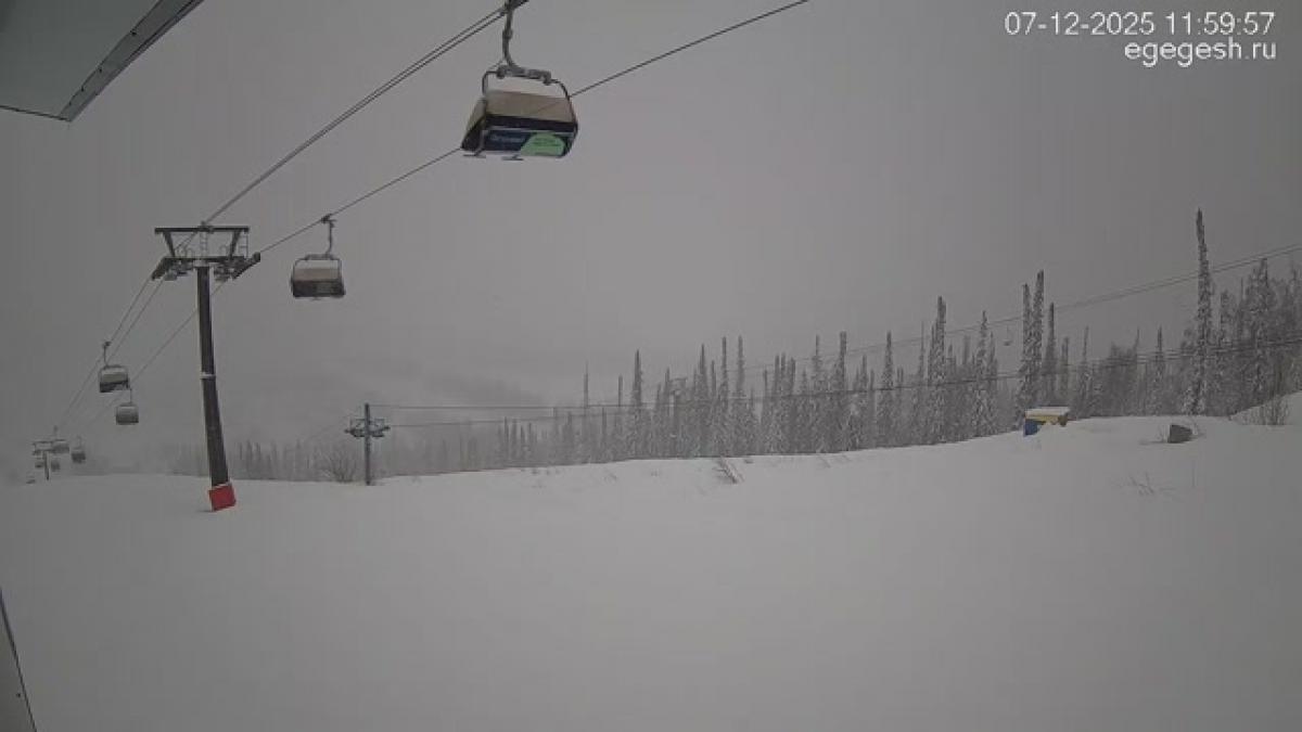 В объективе обзорной веб-камеры открывается вид на подъёмник «Олимпия-Экспресс», отели на горе Зелёная и посёлок Шерегеш. Справа на видео виден кресельный подъёмник «Фристайл».