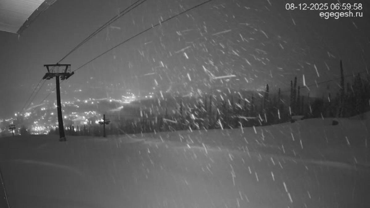 В объективе обзорной веб-камеры открывается вид на подъёмник «Олимпия-Экспресс», отели на горе Зелёная и посёлок Шерегеш. Справа на видео виден кресельный подъёмник «Фристайл».