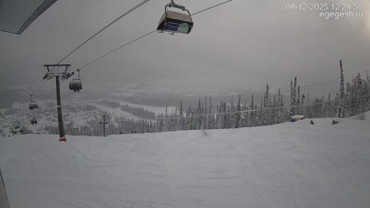В объективе обзорной веб-камеры открывается вид на подъёмник «Олимпия-Экспресс», отели на горе Зелёная и посёлок Шерегеш. Справа на видео виден кресельный подъёмник «Фристайл».
