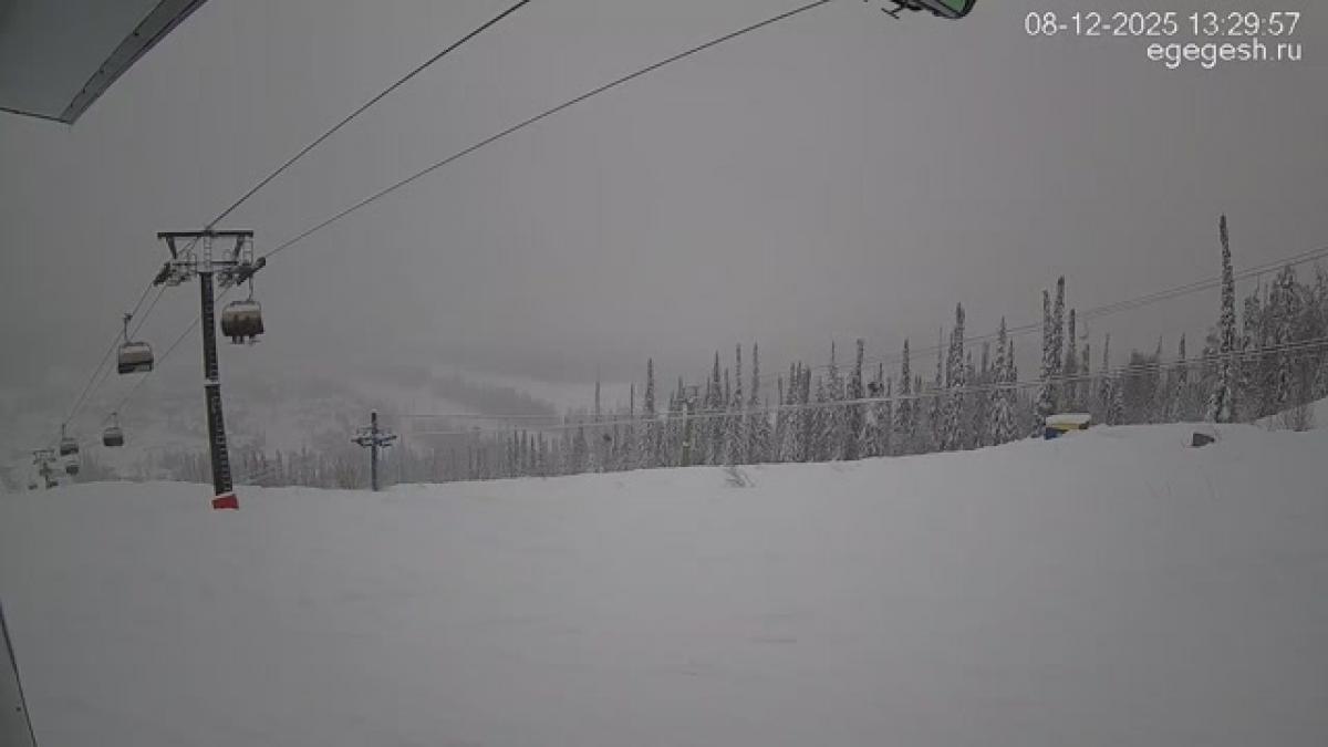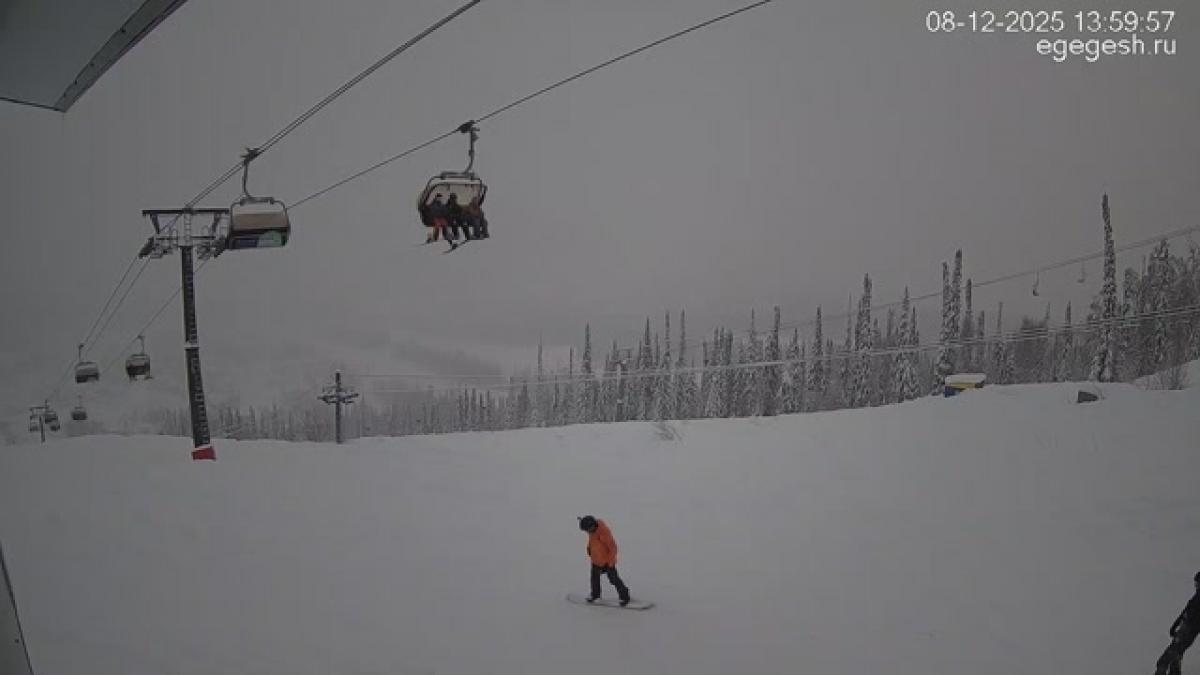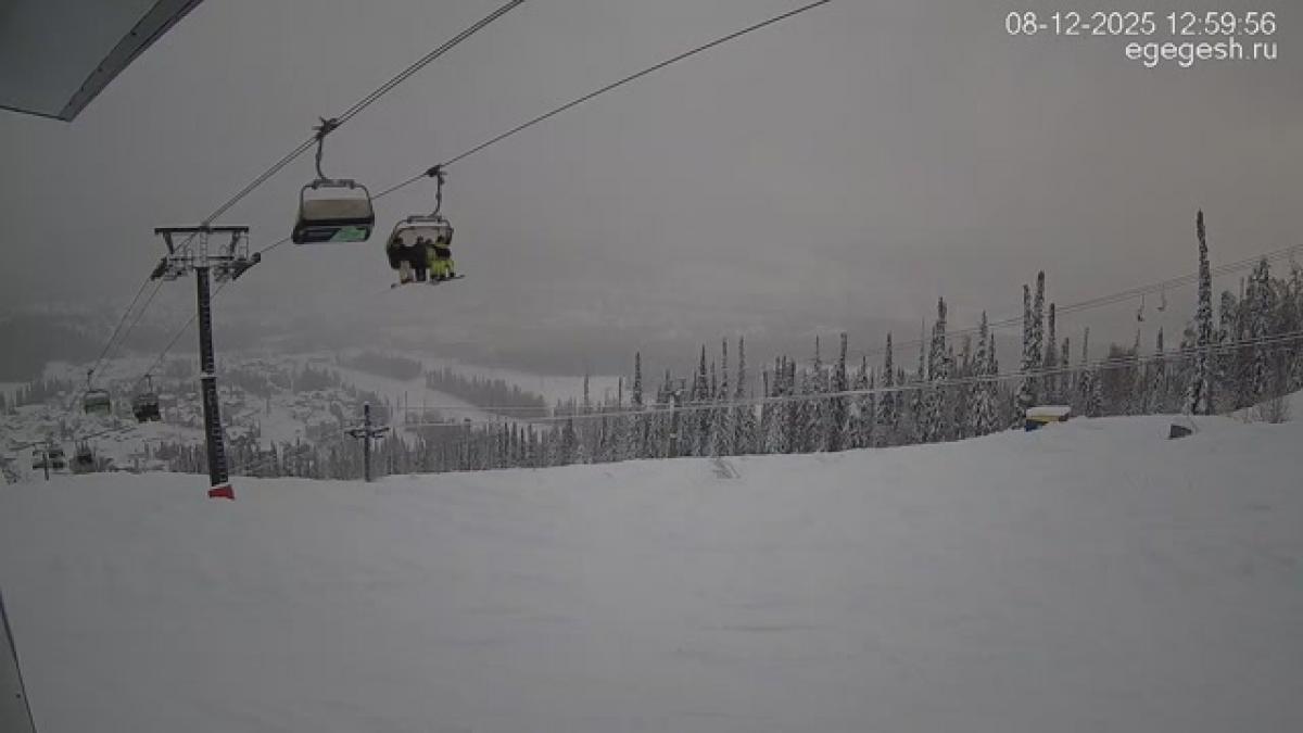 В объективе обзорной веб-камеры открывается вид на подъёмник «Олимпия-Экспресс», отели на горе Зелёная и посёлок Шерегеш. Справа на видео виден кресельный подъёмник «Фристайл».