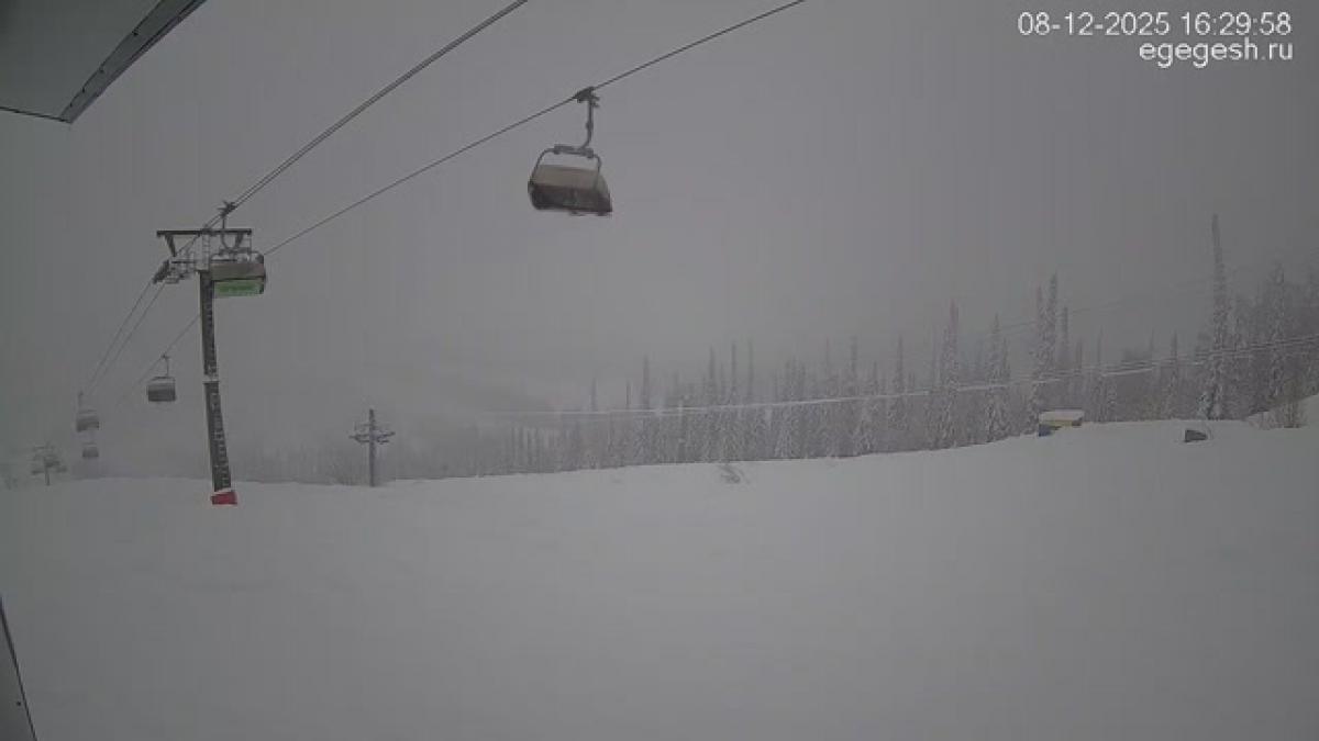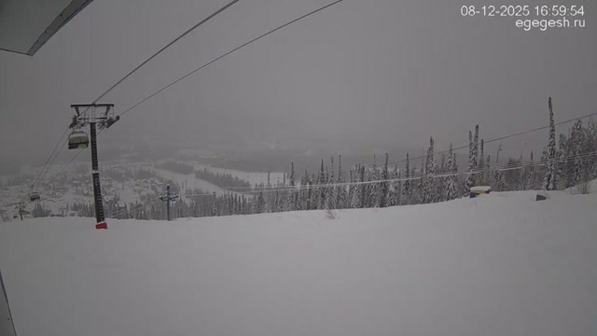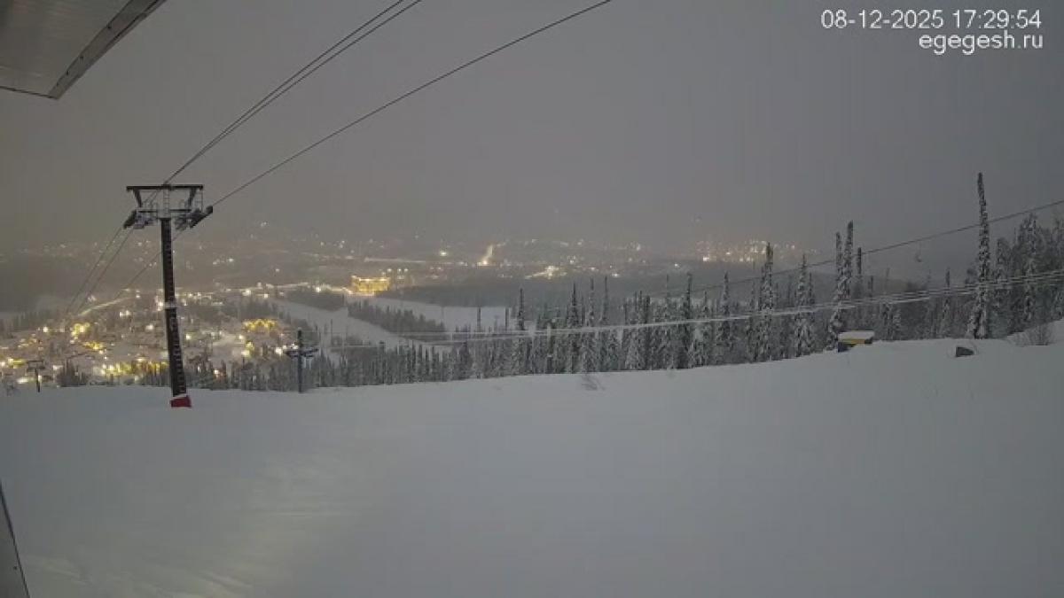 В объективе обзорной веб-камеры открывается вид на подъёмник «Олимпия-Экспресс», отели на горе Зелёная и посёлок Шерегеш. Справа на видео виден кресельный подъёмник «Фристайл».