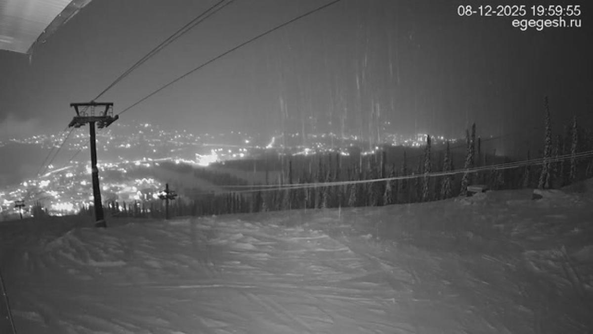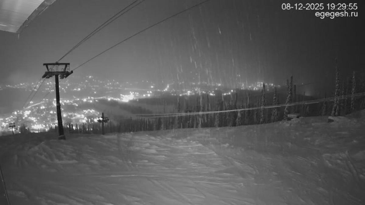 В объективе обзорной веб-камеры открывается вид на подъёмник «Олимпия-Экспресс», отели на горе Зелёная и посёлок Шерегеш. Справа на видео виден кресельный подъёмник «Фристайл».